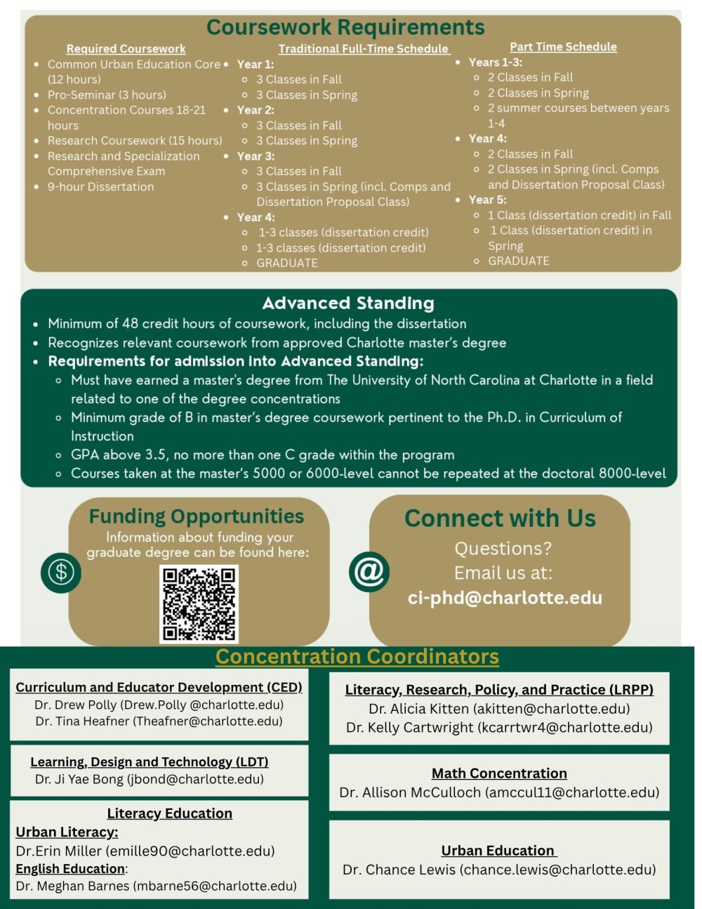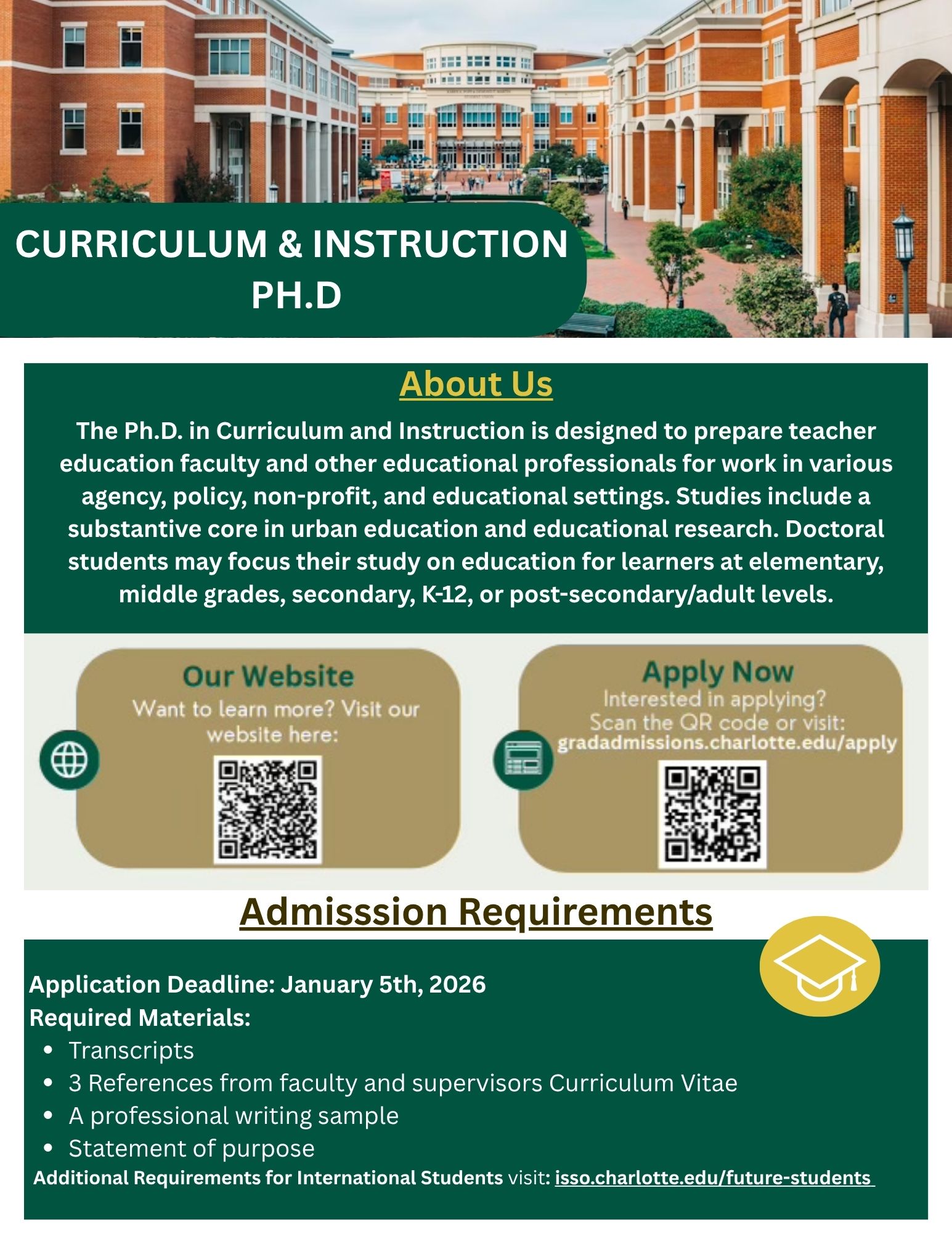 The Doctor of Philosophy in Curriculum and Instruction is an interdisciplinary degree program involving faculty from across the University of North Carolina at Charlotte campus, and primarily the Departments of English; Mathematics and Statistics; Middle, Secondary, and K-12 Education; Reading and Elementary Education; and Educational Leadership.